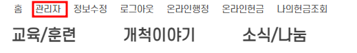 화면 상단에서 로그인을 하시면 아래와 같이 로그인 한 자리가 바뀌게 되고, 관리자를 클릭하셔서 관리자모드로 들어가게 됩니다