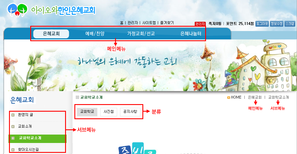 관리자는 최고관리자, 그룹관리자(메인메뉴관리자), 서브메뉴관리자로 구분할 수 있습니다.
