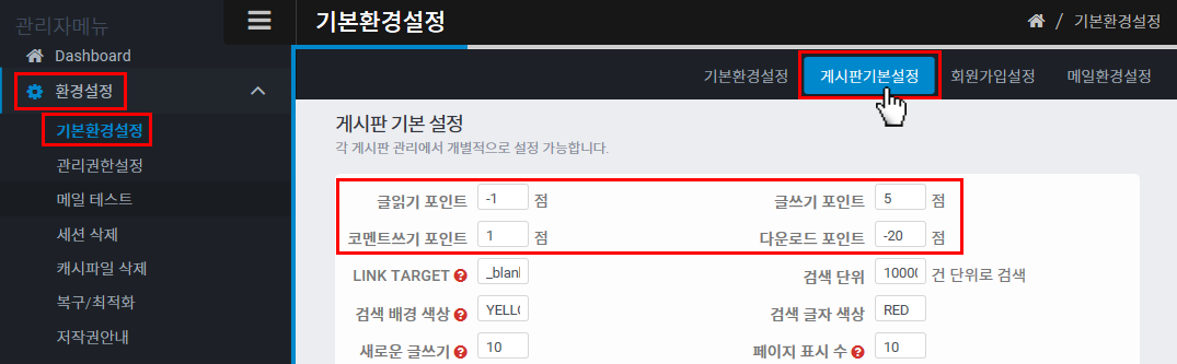 관리자모드>환경설정>기본환경설정에 가셔서 두번째 Section에 "게시판기본설정"이란 부분이 있는데 여기에 기본적인 4가지 항목에 대한 포인트 설정을 하는 부분이 있습니다.