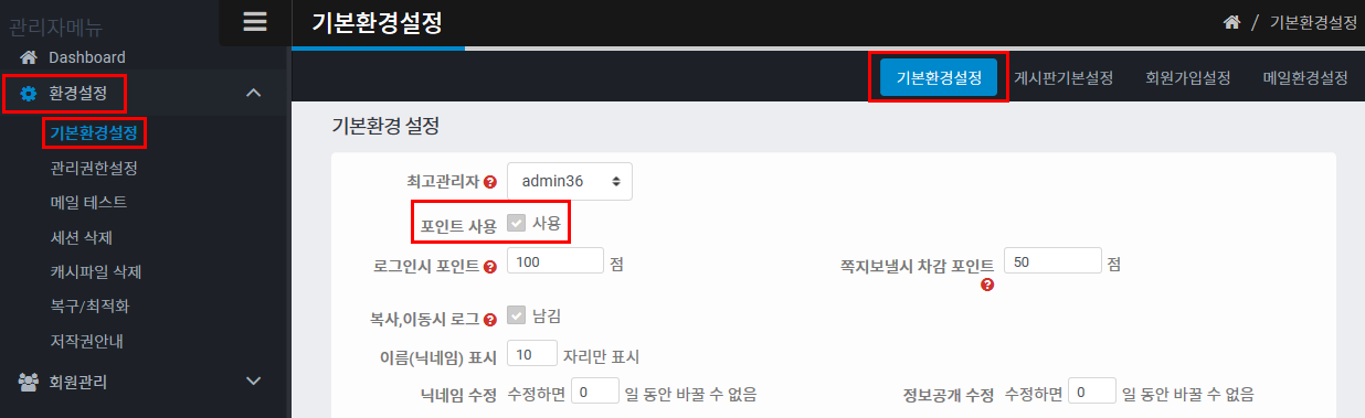 관리자모드 > 환경설정 > 기본환경설정에 가시면 상단에 "포인트사용"이라는 항목이 있습니다.