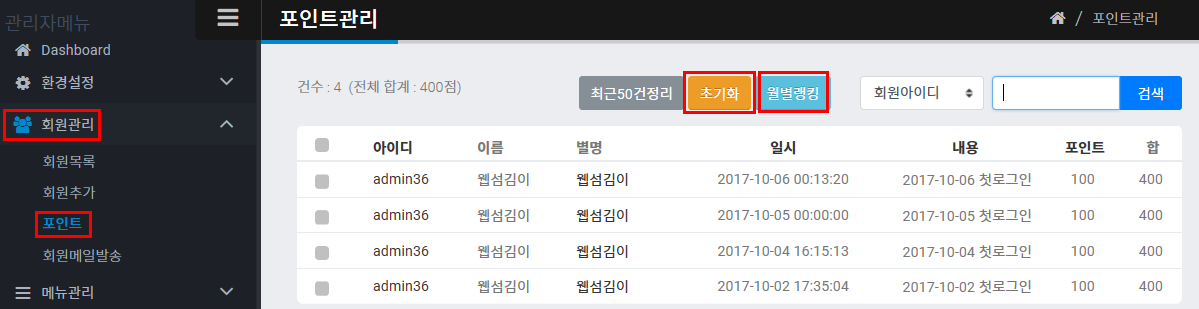 관리자모드 > 회원관리 > 포인트로 가시면 "월별랭킹"을 통해 월별 포인트를 확인할 수 있고, 포인트는 "초기화"를 할 수 있습니다.