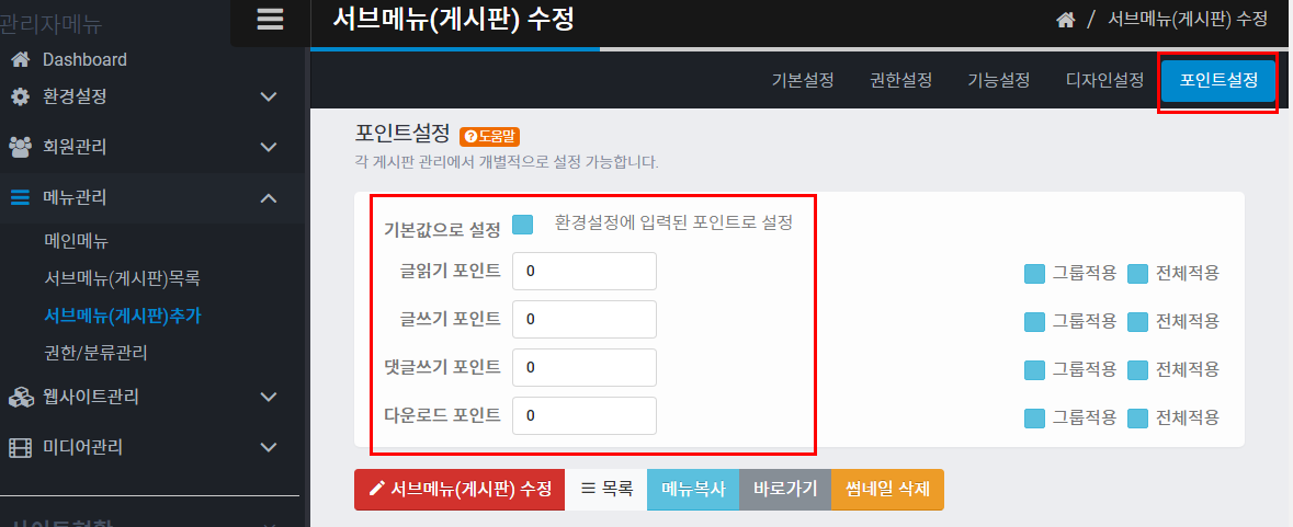 기본적으로 0으로 되어 있는데, 이때는 위 환경설정에서 설정한 값을 이용합니다. 게시판마다 점수를 다르게 부여하고 싶으실때 변경하시면 됩니다.