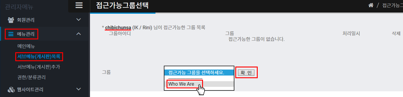 접근사용이란 특정 메인메뉴를 일부 회원들에게만 공개할 수 있는 기능을 말합니다.