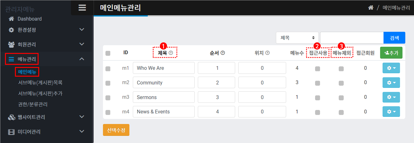 메뉴관리 > 메인메뉴로 들어가시면 아래와 같은 화면이 나옵니다.