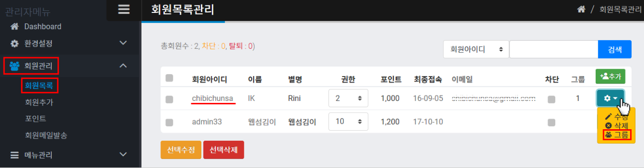 2) 회원관리 > 회원목록으로 가셔서 접근사용을 원하시는 해당 아이디(아래 예: chibichusa)의 설정버튼을 눌러 그룹을 클릭합니다.