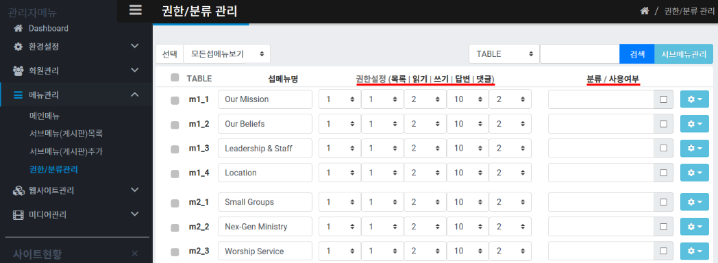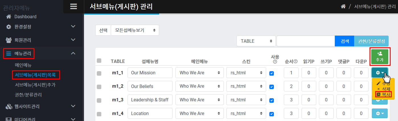 서브메뉴의 수정, 추가, 삭제 등의 작업이나 권한변경, 포인트부여 등 각종 기능을 사용할 수 있습니다.