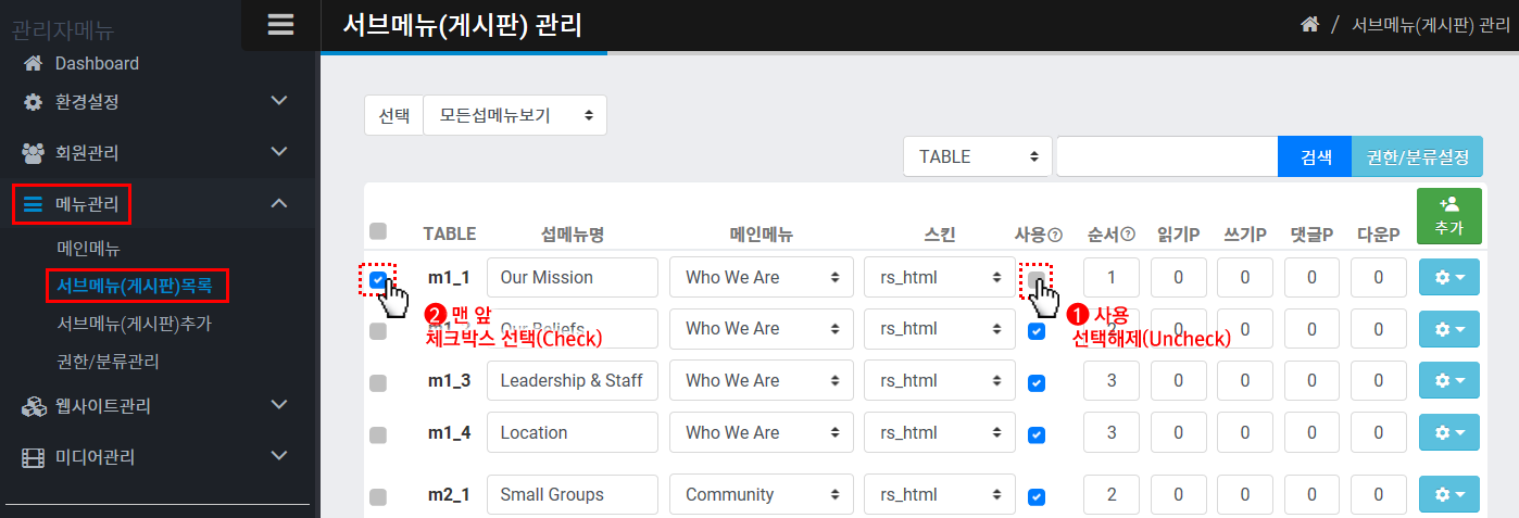 서브메뉴(게시판)목록에서 사용하고 싶지 않은 메뉴의 "사용" 항목에 있는 부분을 선택해제(uncheck)하시고,