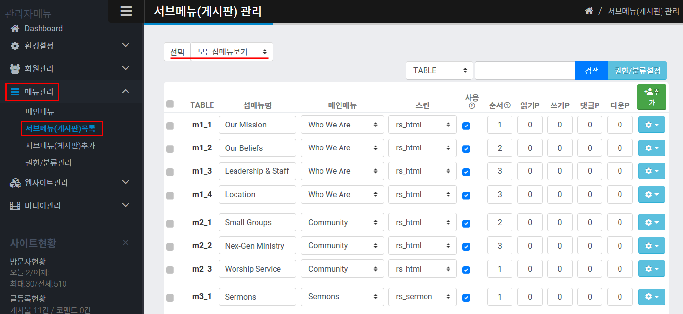 서브메뉴관리는 홈페이지 유지보수관리에서 자주 사용되는 기능입니다.