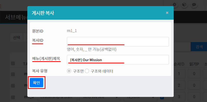 " 를 클릭하시면 아래와 같은 팝업창이 생성됩니다. 창에서 복사ID이름과 메뉴(게시판)제목을 넣고 확인버튼을 누르시면 됩니다.