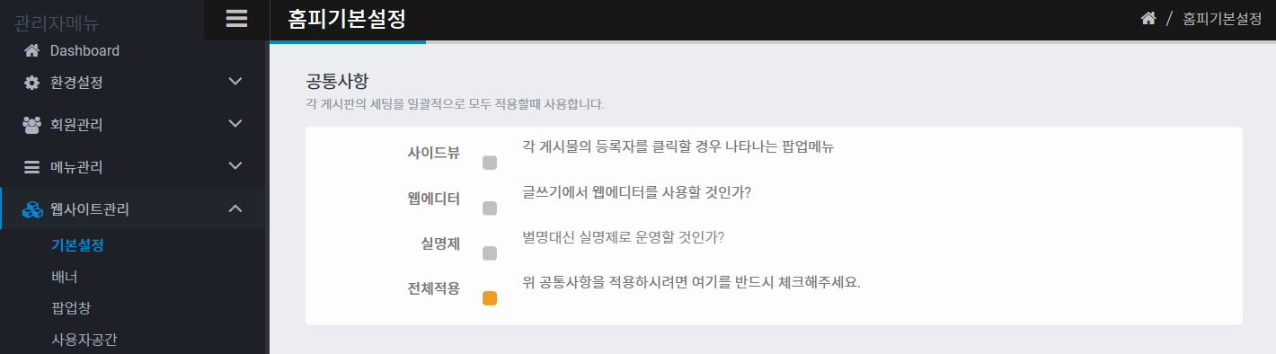 모든 서브메뉴는 각각의 관리화면이 있습니다. 그러나 자주 쓰는 기능을 각각 따로 체크하기에는 많은 시간이 걸리기 때문에 공통사항에서 한번에 설정할 수 있습니다.