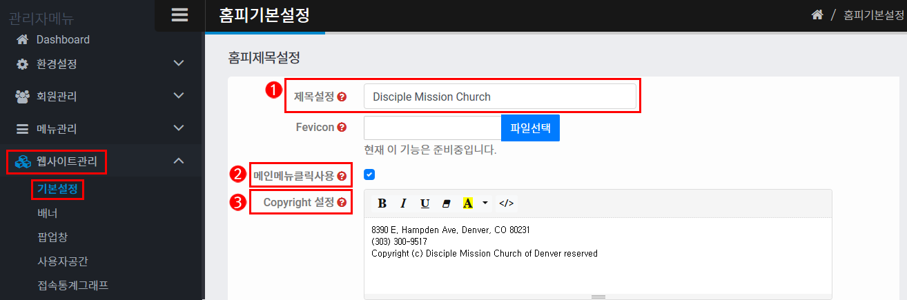 웹사이트관리 > 기본설정에 들어가셔서 설정할 수 있습니다.