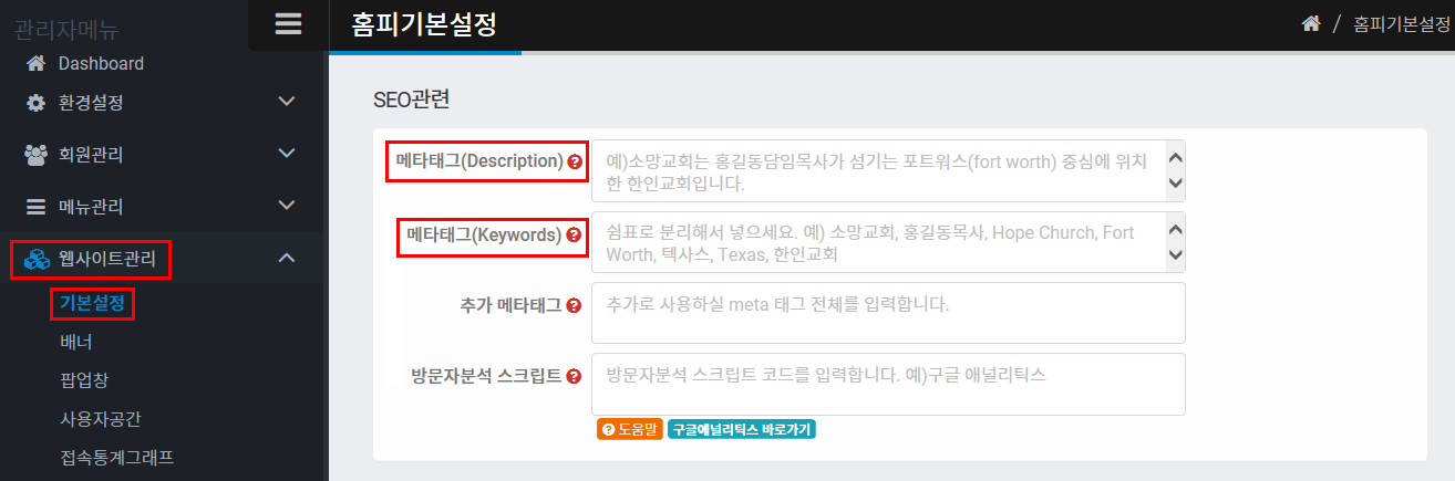 웹사이트관리 > 기본설정에 가시면 메타태그(Description, Keywords)를 설정하실 수 있습니다.