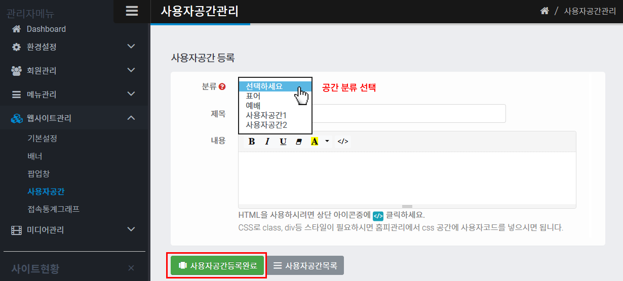 2. 사용자공간 내용 등록방법