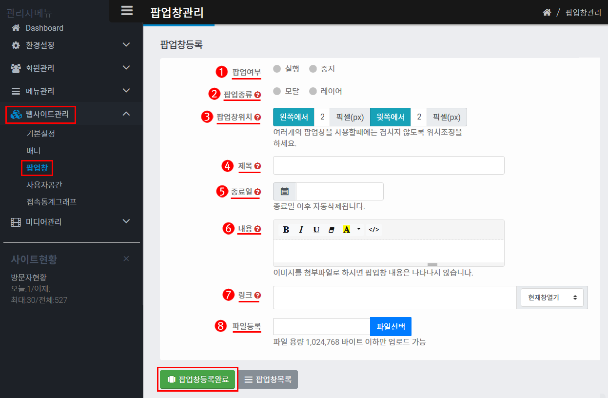 웹사이트관리 > 팝업창으로 들어가면 팝업창관리 화면이 나오고,