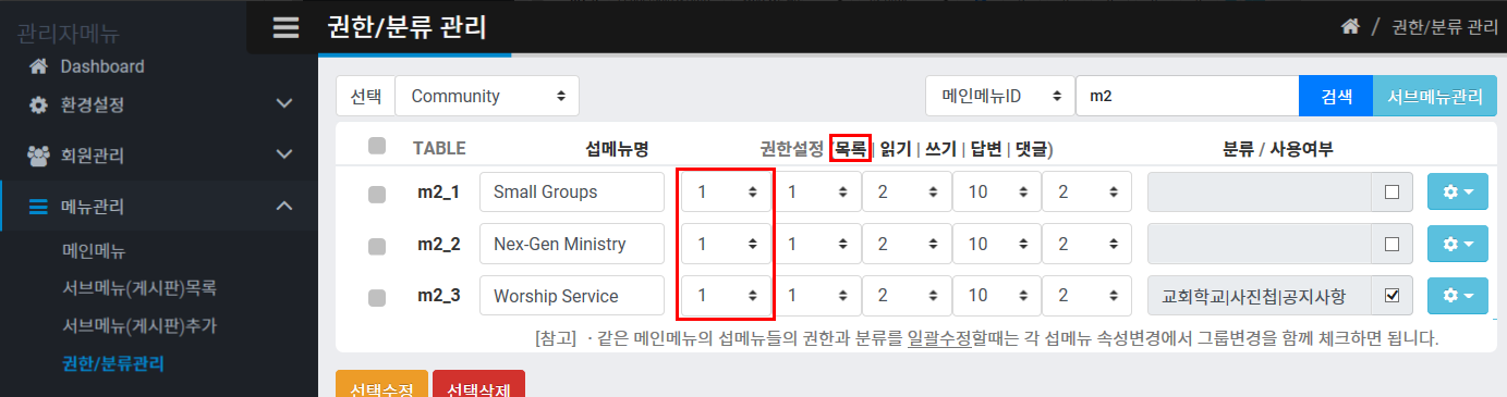 권한/분류설정 리스트에서 (1)해당 메뉴의 권한을 조절하시고, (2)앞의 체크박스를 선택하셔서 하단의