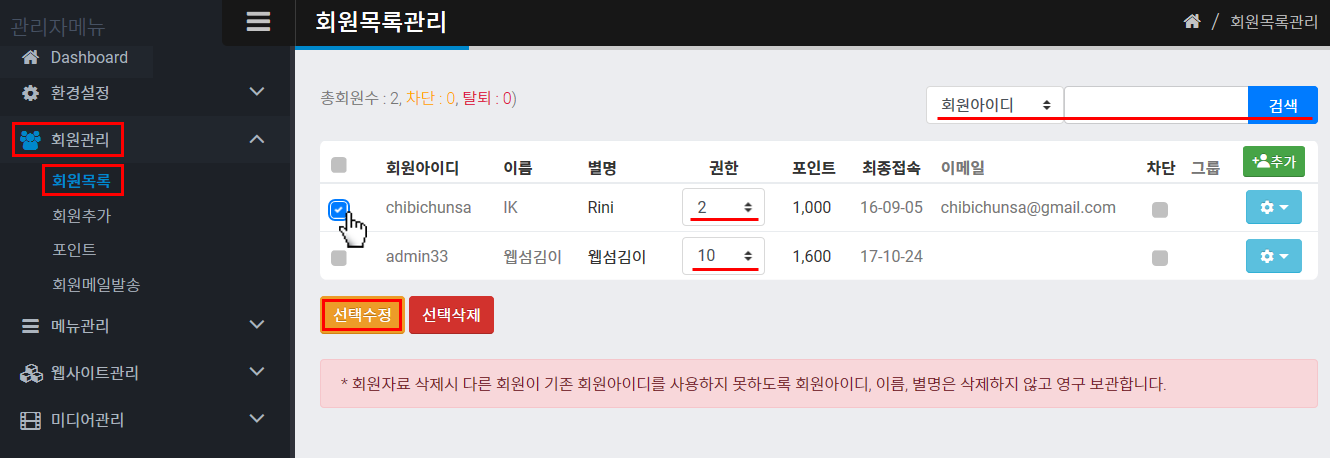 변경하실 때는 원하시는 회원의 등급을 변경한 다음 앞부분 체크박스를 체크하시고