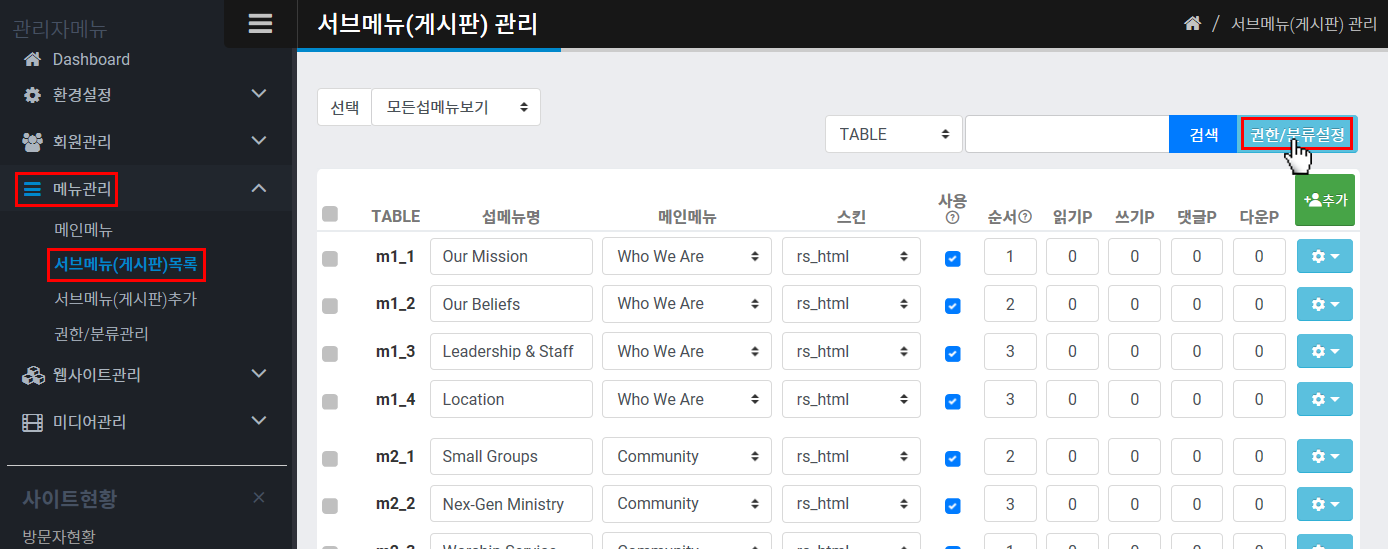 한꺼번에 권한을 쉽게 조절하는 방법은 관리자모드에서 메뉴관리 > 서브메뉴관리로 들어가셔서 우측상단의
