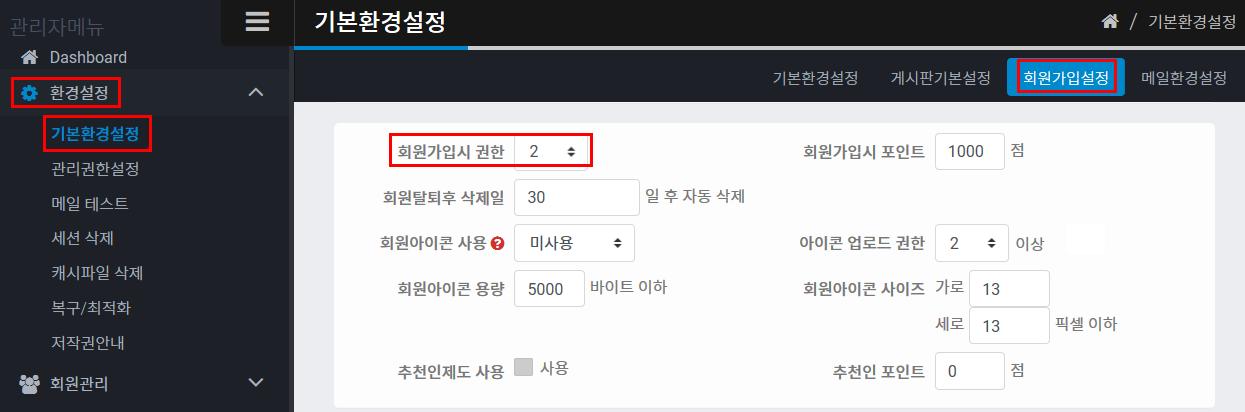 변경이 필요할 때는 환경설정 > 기본환경설정 > 회원가입설정 에서 가능합니다.