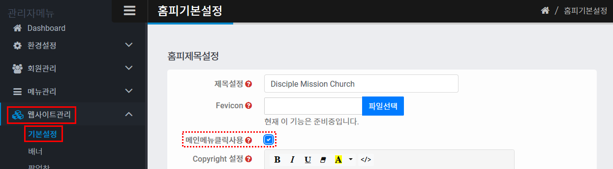 먼저 웹사이트관리 > 기본설정에서 메인메뉴클릭사용을 선택하여 줍니다. 그리고 하단의 "