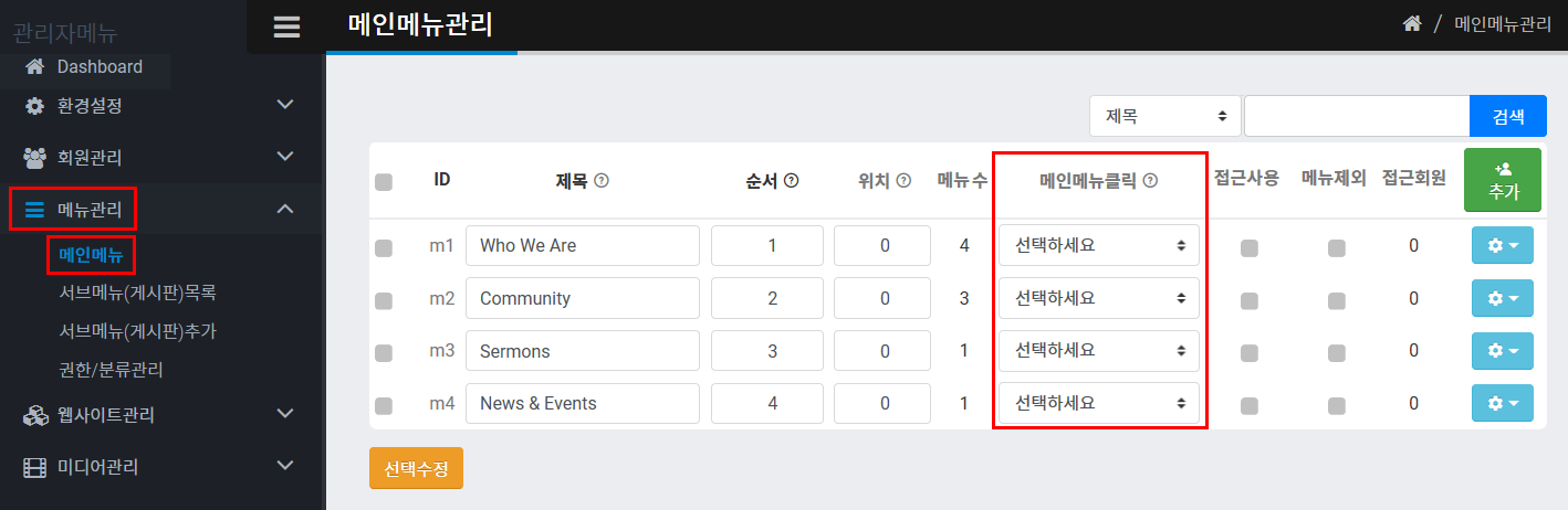 위 1번의 설정변경으로 메인메뉴의 클릭이 활성화 되었습니다. 세부적인 세팅은 메뉴관리 > 메인메뉴관리로 들어갑니다.