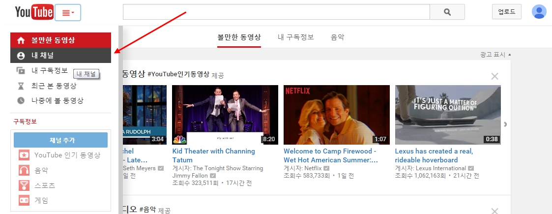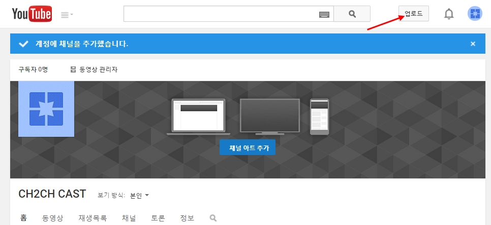 6) 채널이 생성되었고, 이제 업로드를 클릭합니다.