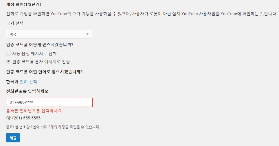 국가선택, 인증코드 받기를 위한 방법을 선택합니다.