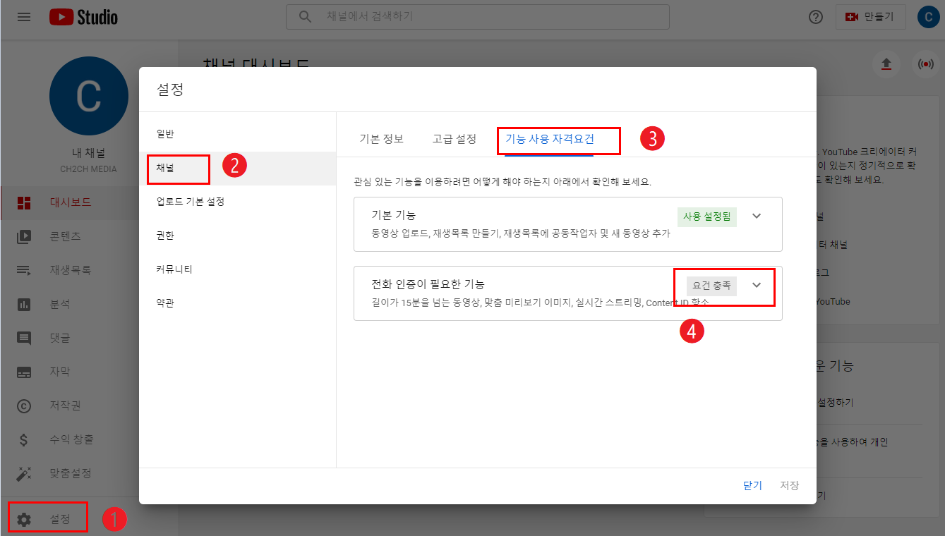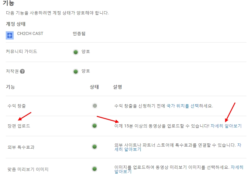 유투브 업로드 화면 하단의 도움말 및 제안사항에서 '한도늘리기'를 클릭합니다