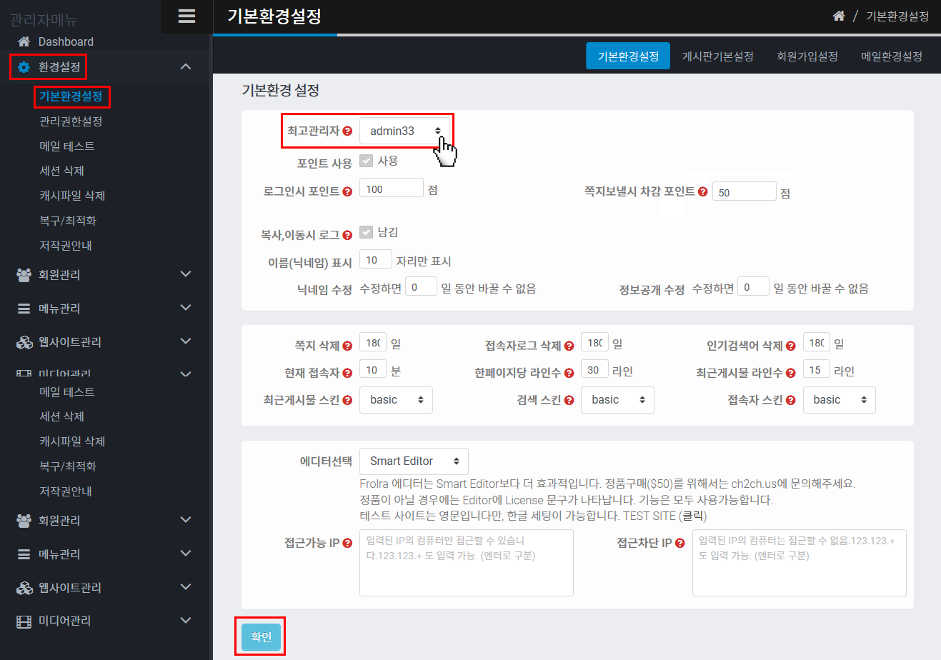 하단의 확인을 눌러주시면 선택된 아이디가 최고관리자로 지정됩니다.