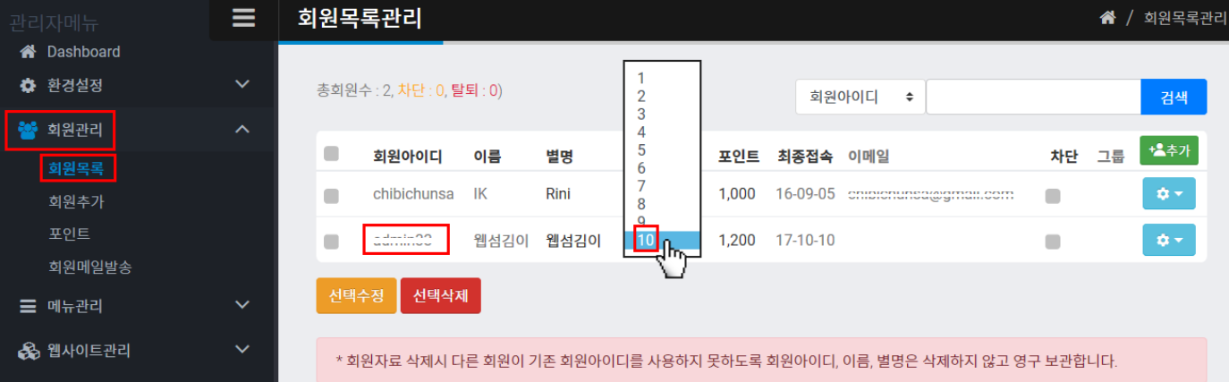 [참고] 아이디의 등급을 10등급으로 지정 했다고 해서 모두 웹사이트 메인관리자가 되는 것은 아닙니다.
