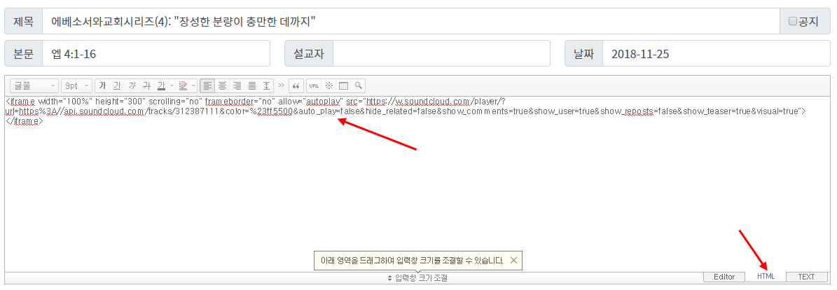 게시판에 넣으실때에는 HTML 모드로 변경하신 위에서 복사한 코드를 넣으시면 됩니다. 그리고 완료버튼을 클릭하세요.